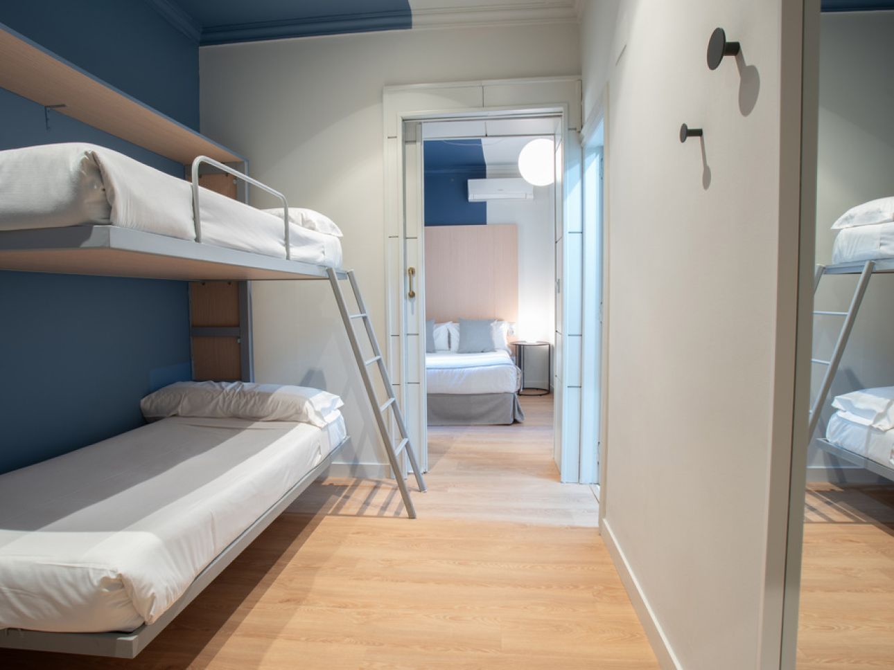 Amplia habitación ideal para viajes en familia o con amigos. Habitación cama doble de 150 cm y litera o dos camas de 105 cm y litera completamente equipadas: - WIFI Gratuito - Cargador USB - Teléfono - Aire acondicionado - Escritorio - TV con pantalla plana - Caja fuerte - Nevera - Baño completo